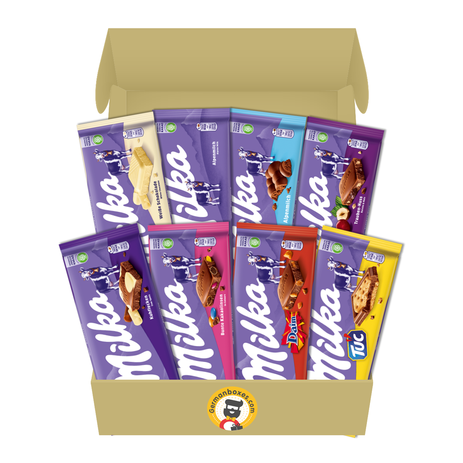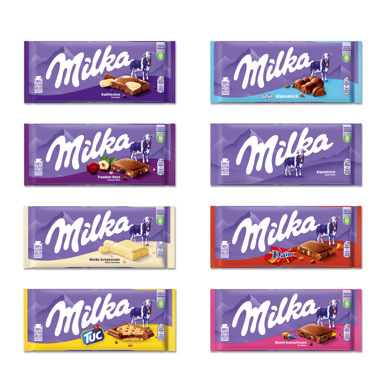An essential selection of Milka chocolates, this box includes 8 bars showcasing the variety of Milka styles and flavours.