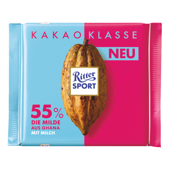 Mild 55% cocoa from Ghana*Ritter Sport's Kakao Klasse ("cocoa class") is a selection of special chocolates at different strengths using beans from around the world. This particular expression is made with 55% cocoa and beans from Ghana.