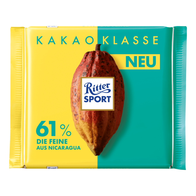 Fine 61% cocoa from Nicaragua*Ritter Sport's Kakao Klasse ("cocoa class") is a selection of special chocolates at different strengths using beans from around the world. This particular expression is made with 61% cocoa and beans from Nicaragua.
