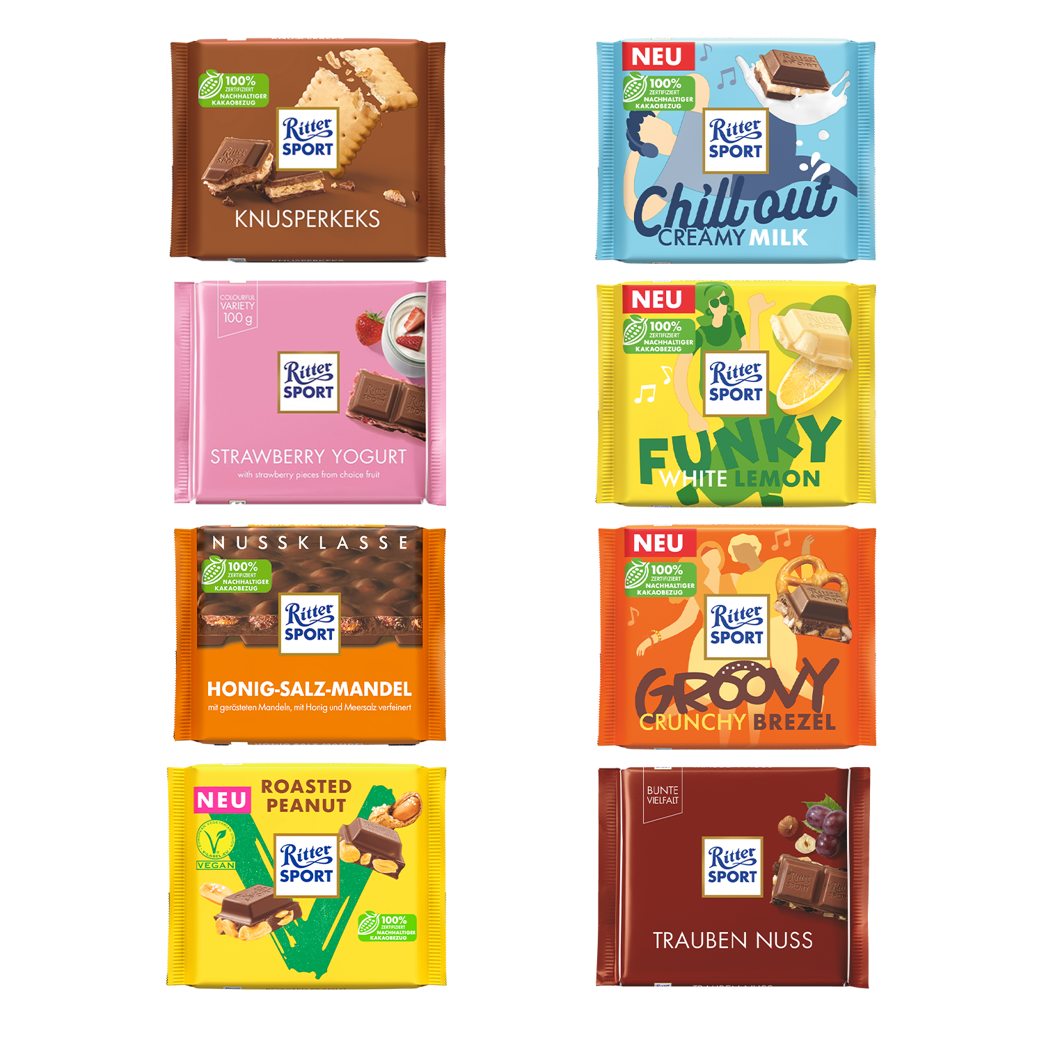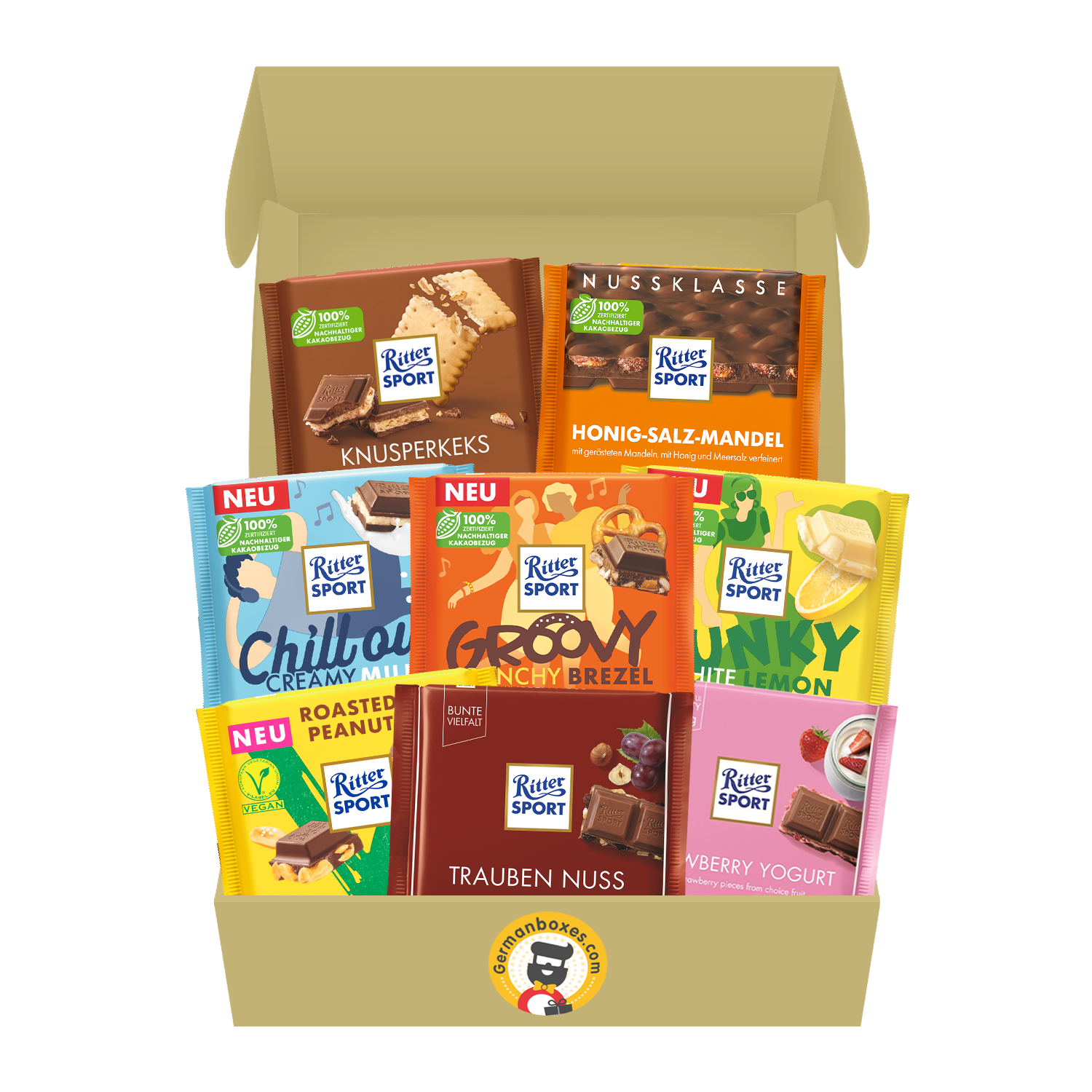 An essential selection of Ritter Sport chocolates, this box includes 8 bars showcasing different styles and flavours.